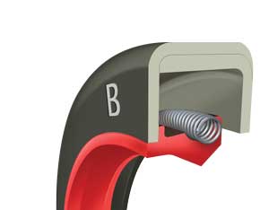 B – Vedação principal com mola. Diâmetro externo de metal com tampa. Geralmente aplicados onde o rolamento joga óleo diretamente na vedação principal.